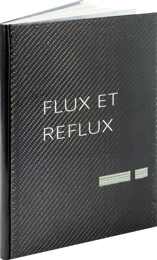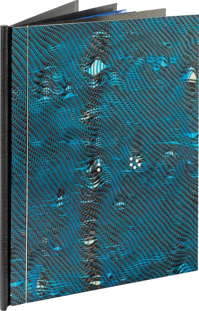 Michel Butor, Flux et reflux, gravures de Khedija Ennifer-Courtois associant eau-forte, carborundum et chines contrecollés, éditions APPAR, Paris, 2006, E.O. n° 25/48. Reliure composite : tissu de carbone T 700, tressage sergé 2/2 6K, contact « à la néo-zélandaise » (pré-imprégnation des tissus avant drapage), glaçages époxy avec inclusion des lettres du titre et du nom de l’auteur, éléments décoratifs tissus composites Kevlar©/ Mylar©, 2013, signée N.Berjon-LB1. © Olivier Bertin – spherique.fr