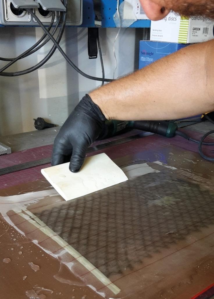 Démoulage de la plaque de composite à la spatule. © Olivier Bertin – spherique.fr