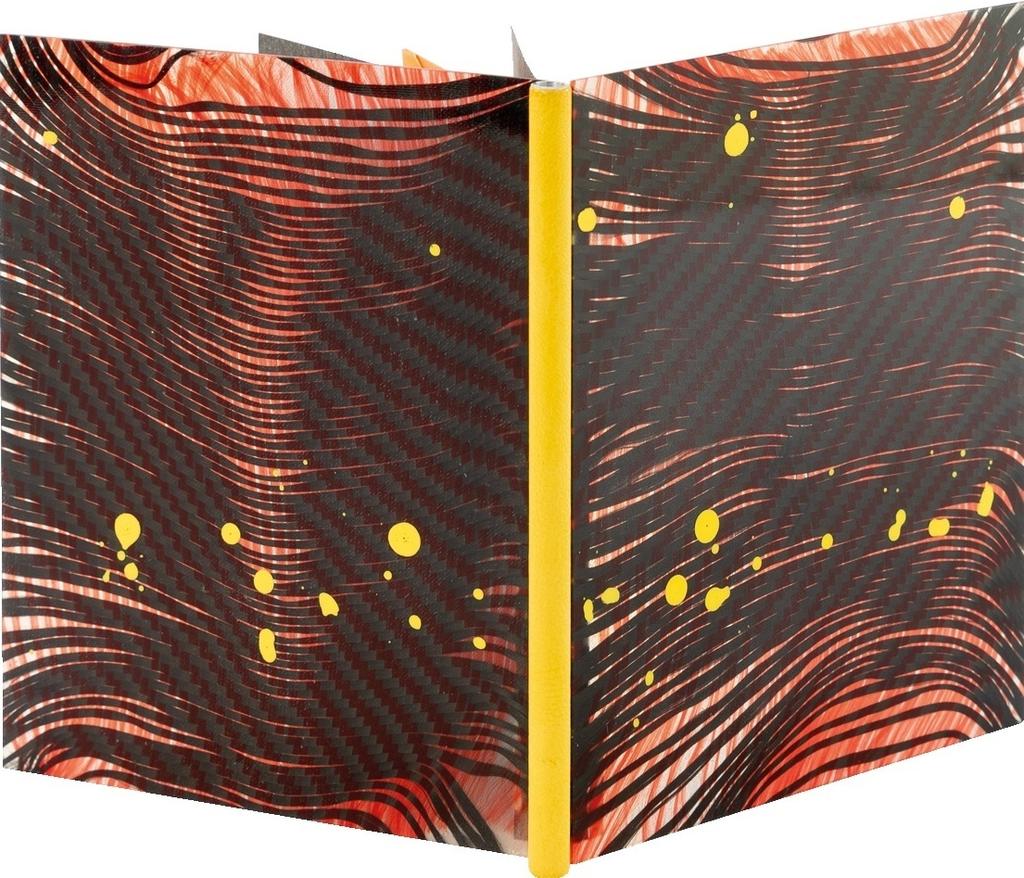 Michel Butor, Soufre, livre d’artiste manuscrit n° II/ III, E.O., peintures originales de Julius Baltazar. Reliure composite : Texalium rouge, décor de fibres carbone et peinture, montée sur un tube aluminium, 2020, signée N.Berjon-LB24. © Olivier Bertin – spherique.fr