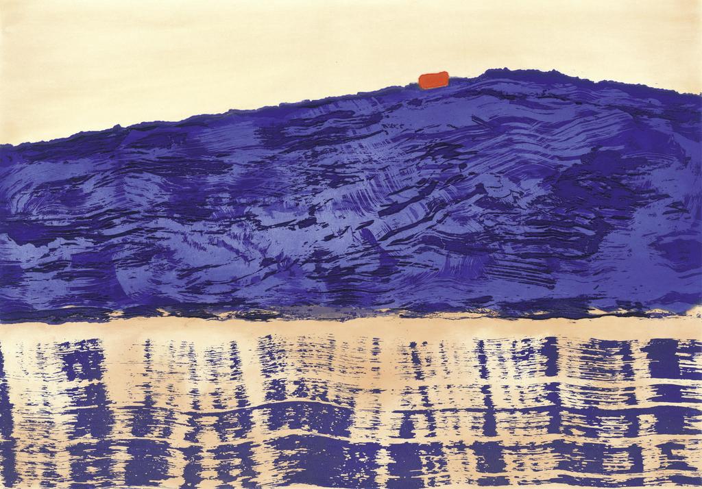 Chaque année, des artistes sont invités par le musée du Louvre à réaliser une gravure dans l’atelier de chalcographie avec l’aide des imprimeurs taille-douciers. J’ai travaillé en étroite collaboration avec Lucile Vanstaevel. C’était une vraie rencontre artistique ! Je suis restée en contact avec elle. Nos techniques sont à la fois proches et tout à fait opposées. Avec l’eau-forte et l’aquatinte, j’étais limitée à deux ou trois couleurs, ce qui est assez restreint quand on est peintre. Je pouvais toutefois explorer le travail de la matière. Nous avons donc joué avec les creux amenés par les acides sur la plaque de cuivre et les effets créés par les vernis de recouvrement. Il en a résulté une estampe texturée intitulée Isola, représentant un littoral rocheux bleu et orange. La dimension expérimentale de la gravure était très stimulante et m’a appris de nouveaux gestes pour la recherche à l’atelier !