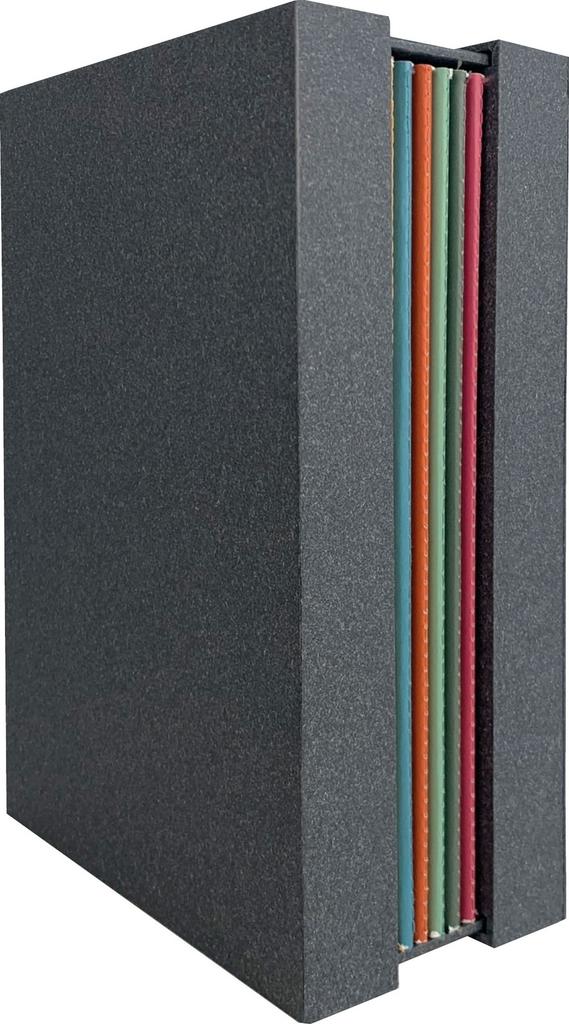 Un seul étui dans cette catégorie : celui de Paul Garcia (Angleterre). Contrairement à toutes les autres propositions, les dimensions extérieures de cet étui sont fixes, et c’est l’épaisseur des plats qui est variable et permet à l’étui de s’adapter à son contenu. Chaque plat est constitué de deux cartons, qui s’écartent l’un de l’autre au moyen d’un ressort métallique dissimulé grâce à un soufflet. Le point faible évident est que le volume occupé par l’étui dans une bibliothèque est le même, quel que soit le contenu de l’étui. Il n’en reste pas moins que l’idée est très intéressante et peut-être à développer pour d’autres applications. Le contenu de l’étui est bien protégé et constamment soumis à une légère pression. Je me demande si cela ne pourrait pas constituer une solution pour des livres rechignant à se fermer, par exemple des reliures en parchemin.