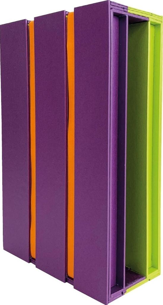 Voici un principe dans lequel les murs sont déconnectés des plats d’un côté, et se prolongent pour former des sortes de rabats de longueurs variables, qui viennent se fixer le long des plats (Bruno Cadiou, France) ou à l’intérieur des plats (Terrie Reddish, Nouvelle-Zélande). Bruno Cadiou propose un système semi-souple en gainage (âme / couvrure), Terrie Reddish un système en carte. Le point fort de l’étui de Bruno Cadiou est son originalité, avec un objet final ayant une esthétique plus proche de l’univers du sac ou du portefeuille que de l’emboîtage rigide traditionnellement mis en œuvre en reliure. La fonction expansion est bonne dans toutes les mesures intermédiaires, le contenu est bien protégé et les rabats qui collent aux plats avec des aimants ne posent pas trop de problèmes aux livres voisins sur les rayonnages. Un travail similaire en carte est moins convaincant car insuffisamment rigide. Notons que c’est le cas, de façon générale, des travaux en carte pour ce sujet. Une personne n’ayant pas envoyé son prototype a finalement développé le principe pour une reliure, nous verrons cela plus loin dans la partie Bonus.
