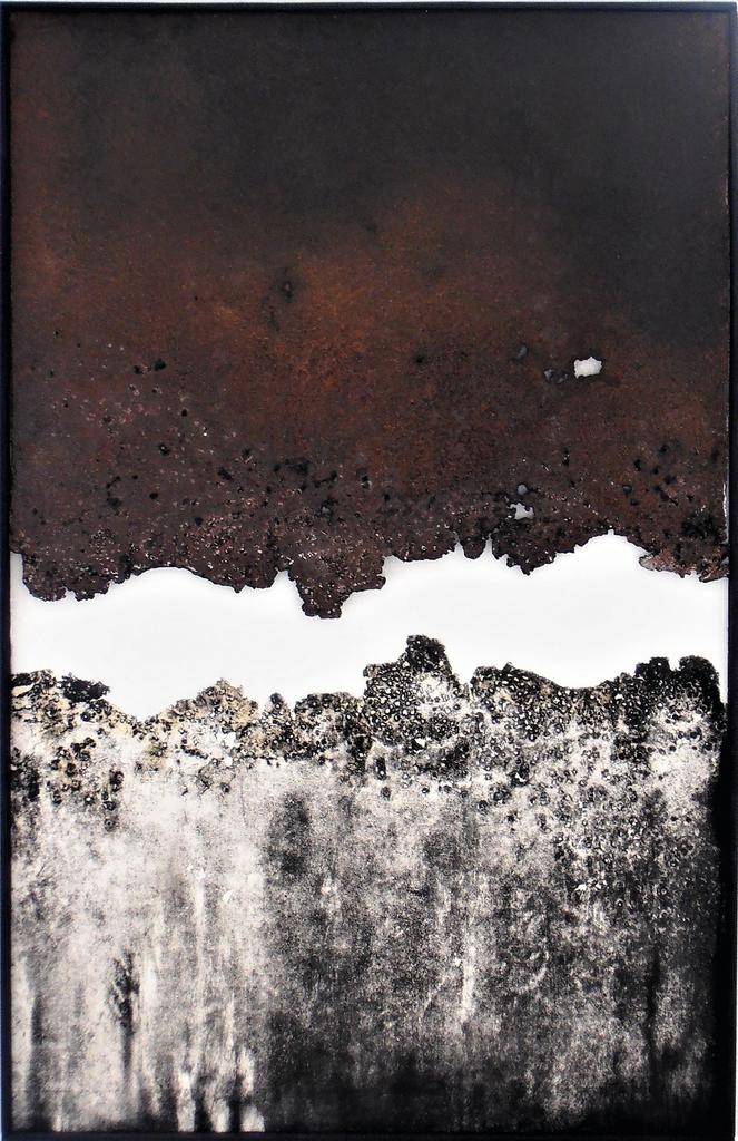 Une autre incursion dans les paysages de Catherine Wintzenrieth avec Sans titre (2021) montre par cette coupe stratigraphique verticale une suite dynamique de sections d’une forte densité. Le regard effectue assez naturellement de la gauche vers la droite une lecture nécessaire pour appréhender une telle langue : d’abord une section réalisée en papier japon auquel se mêlent des traînées dues à des empreintes de bois, une deuxième constituée de veinures de bois jouxte une zone d’enlèvement, elle-même voisinant avec un support rude, celui du contreplaqué nivelé par un passage au rouleau, tandis qu’un éclatement de la matière savamment guidé magnifie l’ensemble. Sa mise en scène parfaitement contrôlée repose en fait sur un instant – long, très long – qui produit comme une succession d’arbres dignes de la forêt magique de Brocéliande. Parfois, un rai de couleur vient enrichir les tonalités qui vont d’un blanc laiteux à des noirs profonds. Catherine Wintzenrieth devient une calligraphe qui procède par essuyage des valeurs d’encre pour obtenir les trouées et les sommets de ces paysages imaginaires. Pénétrer dans cet univers végétal, minéral, de doute et de transgression des formes, renvoie aux images sublimées d’une nature vraisemblable ou trompeuse. L’artiste fige un réel où l’illusion teintée de perfection complexe – le geste créatif – offre une brillante démonstration des interactions silencieuses entre des mondes aussi fourmillants et intenses que le sont gravure, peinture et sculpture.
