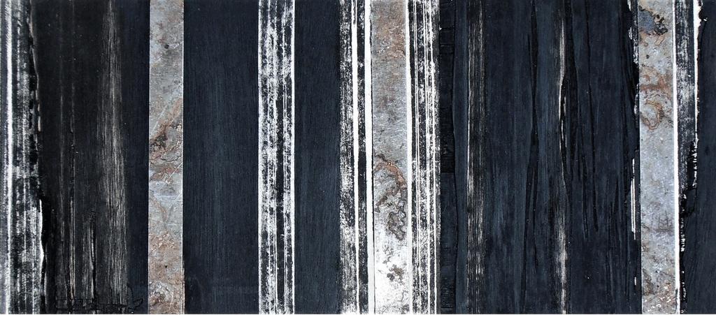 La mosaïque permet à l’artiste de s’orienter vers la gravure. Elle fréquente l’atelier de Florence Hinneburg, où elle a « poursuivi [ses] recherches en mélangeant les techniques, les assemblages, les superpositions, mettant en relief des traces, des rythmes, des ombres et des lumières, travaillant les effacements, donnant la place aux vides ». Cette appropriation contrôlée de l’espace repose sur un choix bien particulier de matériaux et de supports : « J’utilise le bois, l’ardoise, le carton, le métal, le papier que je sculpte, grave, déchire… Chaque matière a une mémoire qui se révèle à l’encrage, à l’impression. » La gravure, traditionnellement un multiple, devient ici, du fait des manipulations effectuées par la créatrice, l’égal d’une pièce unique rayonnant d’une atmosphère où le regard et la contingence trouvent un équilibre propice. Ces rythmes venus d’ailleurs, de l’élément terre comme du bois, du fer, de l’air, voire de l’eau, sont pleinement constitutifs du travail de l’artiste. Quelques grandes œuvres emblématiques résument cette recherche d’un fragile équilibre dans ses alliances inédites de matières. Ainsi en va-t-il de Sans titre (2020), vaste et longue composition qui induit un onirisme bien proche de La Ville entière de Max Ernst évoquée plus haut. À la monumentalité de la pièce peinte, devenue quasiment une cité fortifiée médiévale digne de Mantegna, répond cette œuvre où la disjonction subtile mais affirmée donne lieu à une double lecture des deux panneaux qui ont la complémentarité de l’osmose. On note le traitement abouti du bois comme de l’ardoise, à l’un la brillance, à l’autre une patine rappelant les espèces fossilisées sauvées par des archéologues soucieux de conserver par leur présence massive un passé enfui.