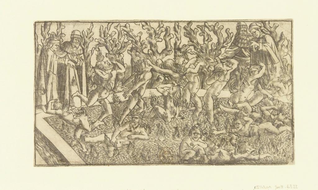 Attribué à Baccio Baldini (1436-1487), d’après Sandro Botticelli (1445-1510), Dante et Virgile en présence des damnés brûlés par une pluie de feu, Florence, vers 1481-1487. Gravure sur cuivre en taille-douce. © BnF, Réserve des livres rares