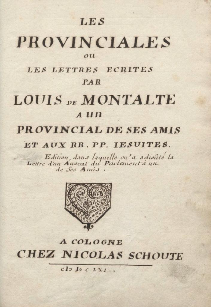 Blaise Pascal, Les Provinciales ou Lettres escrites par Louis de Montalte à un provincial de ses amis et aux RR. PP. Jésuites…, 1657, édité à Cologne, chez Nicolas Schoute, cote Ep 0125. © Bibliothèque du patrimoine de Clermont Auvergne Métropole