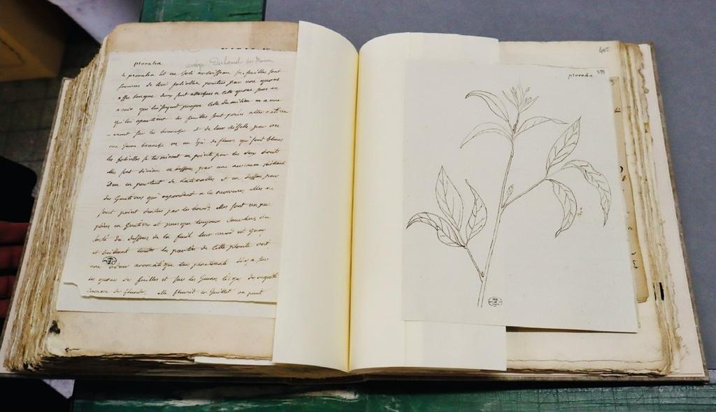 Pour la restauration des parchemins, Christine Bastard précise qu’il faut nourrir le cuir avec délicatesse. Celui-ci étant très sensible aux variations hygrométriques, il est nécessaire, avant toute intervention, de le mettre à plat dans une atmosphère stable avec un taux d’humidité relative proche de 50 %. Concernant la collection des vélins, chaque peinture a été nettoyée avec précaution par gommage dans l’atelier avant sa numérisation. Les grands port-folios en maroquin rouge aux armes du roi, qui avaient été fabriqués pour les conserver en liasses, existent toujours. Un livre d’Henri Duhamel du Monceau vient d’être restauré. Cet éminent scientifique qui vécut au XVIIIe siècle a laissé une œuvre importante dans le domaine de l’ingénierie alors qu’il était inspecteur général de la Marine. La bibliothèque du Muséum national d’histoire naturelle a acquis en salle des ventes, en 2013, ce volume composé de toutes sortes de documents, notes manuscrites, pages imprimées, dessins. Christine Bastard a décidé de garder ensemble ces éléments de divers formats dans une même reliure en réalisant un montage sur onglets repliés qui garantit au livre une ouverture à plat. Avant la création de l’atelier, ce type de travail était envoyé à la Bibliothèque nationale de France. Aujourd’hui, les livres peuvent être traités sur place. À chaque fois qu’une intervention est réalisée à l’atelier de restauration du Muséum, une fiche détaillée ainsi qu’un dossier photographique des différentes étapes de restauration sont constitués et soigneusement archivés, afin de faciliter une éventuelle intervention postérieure.