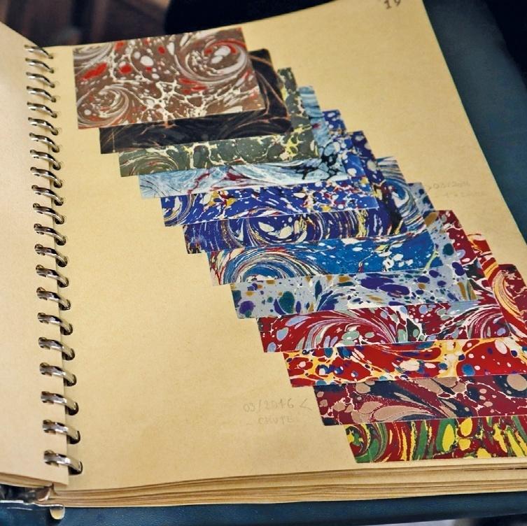 Extrait des pages des catalogues des papiers marbrés rassemblés par Pierre Millot, le fondateur de l’atelier. © Alain Richard