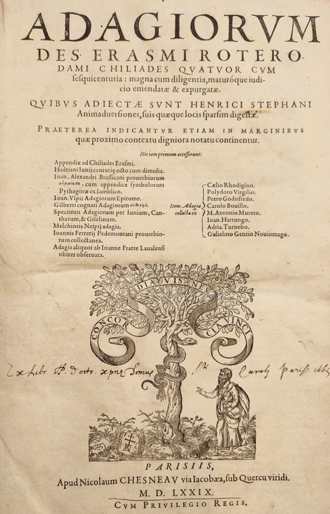 « Best-sellers de la Renaissance, très prisés par les enseignants, les Adages connaissent onze éditions révisées et enrichies par l’auteur jusqu’à sa mort en 1536 […]. »