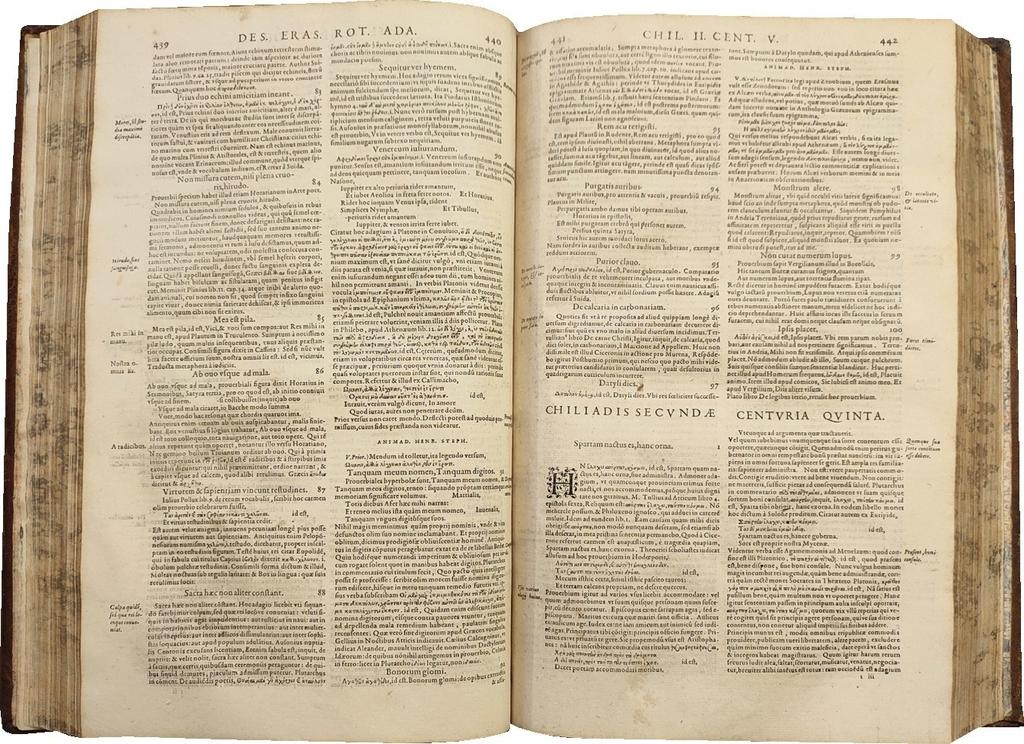 Sont aussi mis en valeur d’abondants compléments, dont les animadversiones de Henri Estienne. Après le quatrain érasmien, placé sous le privilège, et la dédicace d’Érasme à Lord Mountjoy, une longue lettre « du typographe au lecteur » rend hommage à l’auteur mais qualifie sa doctrine de « singulière ». Il s’agit de justifier à la fois l’intérêt des Adages… et leur nécessaire amendement, fondé sur les sages décisions du concile de Trente. Les adages de 1571 sont gravement amputés et, de ce fait, défigurés : l’adage « Qui porte un veau porte un taureau » (no 855), né selon Érasme « dans un lupanar » et expliqué par une longue citation de Pétrone, devient un simple et plat éloge de la discipline d’entraînement.