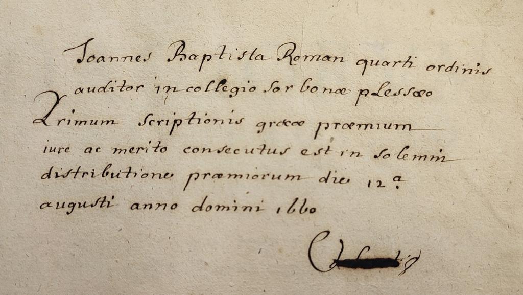 Mention du prix reçu par Jean-Baptiste Roman en 1660. © École nationale des Chartes