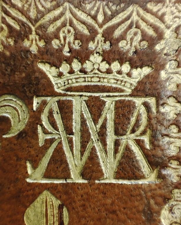 Mais, tandis que le semé de fleurs de lys de cette splendide reliure laisse normalement place, au centre, au chiffre du collège (PS pour Plessis-Sorbonne), notre exemplaire présente les armoiries d’Emmanuel-Joseph de Vignerot du Plessis (1639-1665). Ce petit-neveu du cardinal de Richelieu avait recueilli les bénéfices religieux de la famille mais, plus intéressé par la guerre que par l’Église, il était sur le point de partir combattre les Turcs en Hongrie. Les plats portent donc écartelé (partagé en quartiers) de Vignerot (d’or à trois hures de sanglier de sable) et de Richelieu (d’argent à trois chevrons de gueules), avec le chiffre du jeune abbé (EVR pour Emmanuel de Vignerot-Richelieu), et non celui du collège.