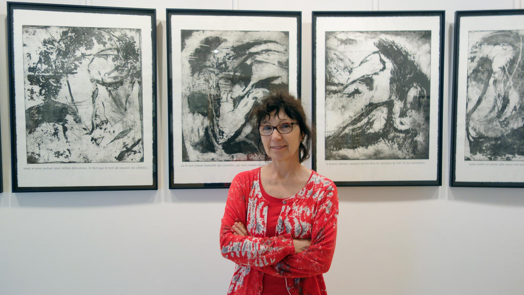 Marie Alloy devant ses gravures, exposition à la médiathèque d’Orléans. © Jean Pierre Vidal. © Jean Pierre Vidal