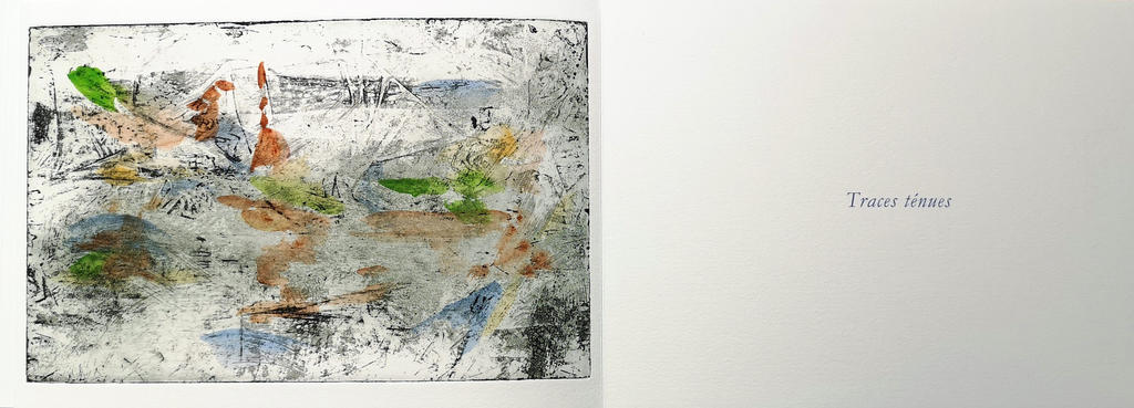 Traces ténues, poèmes inédits de Philippe Mathy, gravures rehaussées à l’aquarelle de Marie Alloy, Le Silence qui roule, 2022. © Marie Alloy