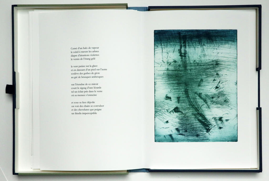 « La gravure est une autre façon d’écrire », on pourrait même la penser comme « le négatif de la peinture » : poète, Marie Alloy a le sens de la formule, et les mots justes pour cerner les subtiles correspondances qui unissent tous les arts qu’elle pratique. Et c’est sans doute aussi pour cette raison qu’elle sait faire résonner ses images. Dans Le Jeu des galaxies (2023), on entend chanter l’eau grâce à la rencontre des différentes nuances de bleu de sa gravure avec le poème de Cécile A. Holdban : « au milieu de la nuit/ dans le bois transi de pluie/ une rivière invisible coule ». Dans une autre de ses parutions récentes, Persistance de l’éclair (2023), des filaments blancs éclatent sur le noir grainé de son aquatinte, faisant vibrer le texte de Jean-Pierre Chambon. Comme l’écrivait Vieira da Silva, que la graveuse aime à citer, « parfois, je ne suis pas très sûre si j’écoute ou je vois ».