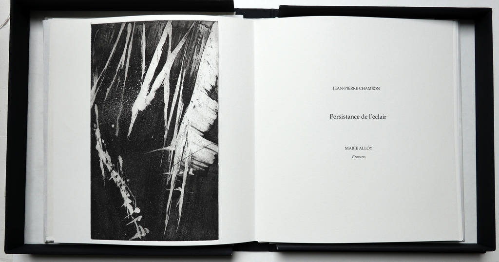 Persistance de l’éclair, poèmes en prose inédits de Jean-Pierre Chambon, six aquatintes et eaux-fortes de Marie Alloy, Le Silence qui roule, 2023. Page de titre. © Marie Alloy