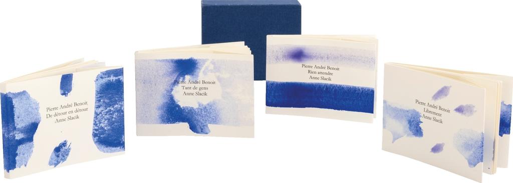L’autre façon de procéder passe par les livres édités – des livres initiés par des éditeurs et non pas autoédités (Anne Slacik tient à cette distinction capitale). Car un livre d’artiste n’est pas réalisé pour satisfaire de simples ego mais pour atteindre un public de vrais connaisseurs. Ces livres sont des commandes d’éditeurs reconnus, au premier rang desquels il faut citer Bruno Roy (Fata Morgana), qui pensait ses livres et avait des exigences. Chez Fata Morgana, outre le Pollen d’Adonis, l’artiste accompagne de 15 peintures, en 2003, Roman de la fluidité de Bernard Noël, texte qui célèbre explicitement le travail de la peintre capable de nous faire glisser « de la contemplation vers la connaissance ». Anne Slacik recourt encore à Bruno Roy quand, en 2003, elle reçoit de Jean-Paul Martin sept manuscrits de Pierre-André Benoit (dit PAB) afin qu’elle « en fasse des livres ». Anne ne s’autorise pas à peindre sur ces manuscrits et demande donc à Bruno Roy de les éditer l’année suivante sous la forme de « minuscules peints » (conformes donc à l’idéal dont PAB était le porteur). Puis c’est aux éditions de Rivières (créées par Jean-Paul Martin, qui est le cousin de PAB), qu’Anne accompagne maints autres poèmes de PAB et convie à la fête quelques poètes amis comme Gaston Puel, Michaël Glück, Agrafiotis, ainsi que Skimao, Teulon-Nouailles, Freixe et aussi Guillevic et surtout Michel Butor – notamment, en 2006, Petit Orchestre portatif, suivi en 2009 du Petit Atelier portatif, deux ouvrages réalisés en quelque sorte « en famille », puisqu’il s’agit d’y célébrer les dons musicaux des enfants de Michel Butor et des enfants d’Anne Slacik. L’art, on l’a dans le sang, aussi ! La complicité d’Anne avec Michel Butor durera des années, sous l’égide de la simplicité scripturale du poète et de son élasticité bienveillante.