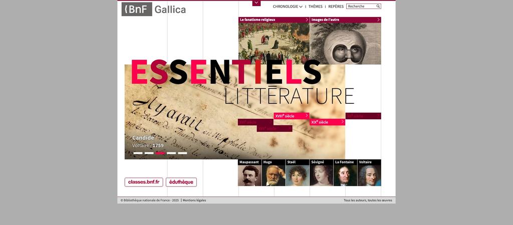 Sur le site Gallica, l’onglet Les Essentiels présente une exposition virtuelle de l’histoire de la littérature, avec des portraits consacrés aux plus grands auteurs. Une chronologie développe en particulier les XVIIIe et XIXe siècles ; elle est complétée par des dossiers thématiques, notamment sur les genres littéraires, et des entretiens audiovisuels avec des spécialistes.