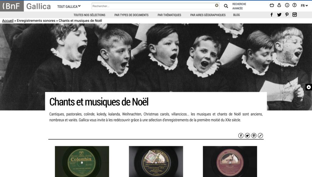 Les chants traditionnels de Noël font partie de notre patrimoine immatériel, et c’est à ce titre que la Bibliothèque nationale de France a souhaité les sauvegarder. Le site Gallica, dans son onglet « Chants et musiques de Noël », permet d’écouter on line une sélection d’enregistrements réalisés à l’origine sur cylindre ou disque 78 tours comportant des airs aussi célèbres que « Les Anges dans nos campagnes » ou « Minuit chrétien ». En explorant ces archives sonores, les auditeurs peuvent redécouvrir la magie de mélodies empreintes de nostalgie.