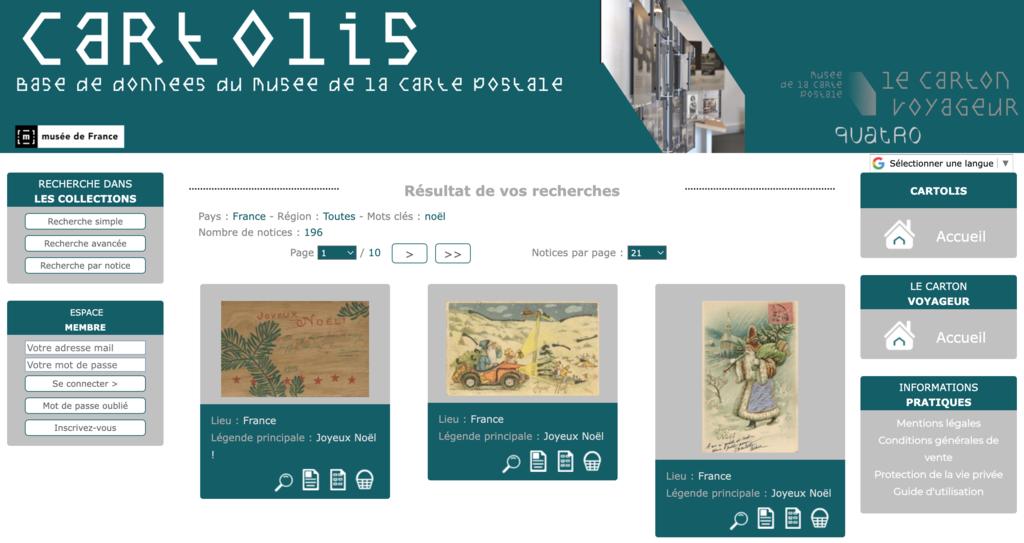 La base de données Cartolis est mise à disposition de l’internaute par Le Carton voyageur, musée de la carte postale de Baud, dans le Morbihan. Parmi la très vaste collection de cartes postales anciennes numérisées, une bonne part concerne le thème de Noël, traité de façon religieuse ou profane. Crèches, sapins, enfants emmitouflés et Père Noël sont les motifs les plus courants ; ces scènes hivernales, évoquant des moments familiaux chaleureux, reflètent l’évolution des représentations graphiques et des traditions. Les cartes de vœux, échangées pour souhaiter bonheur et prospérité à l’aube de la nouvelle année, ne sont pas en reste, traitées elles aussi de la façon la plus diverse.