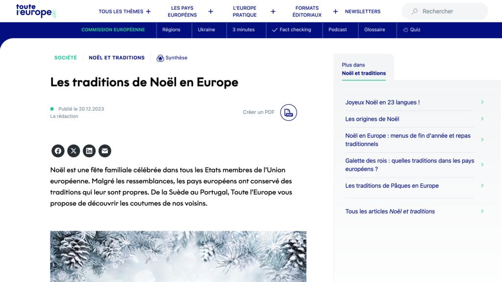Enfin, le site « Toute l’Europe », dans son dossier sur les traditions de Noël européennes, propose un tour d’horizon des coutumes festives qui animent les différents pays du continent durant cette période. Des décorations de sapin allemandes aux célébrations des Rois mages en Espagne, en passant par le vin chaud scandinave ou le panettone italien, ce dossier met en lumière la diversité et la richesse des coutumes européennes. Chaque pays apporte sa propre touche à cette fête, créant ainsi un riche panorama culturel, mêlant racines communes et spécificités locales.