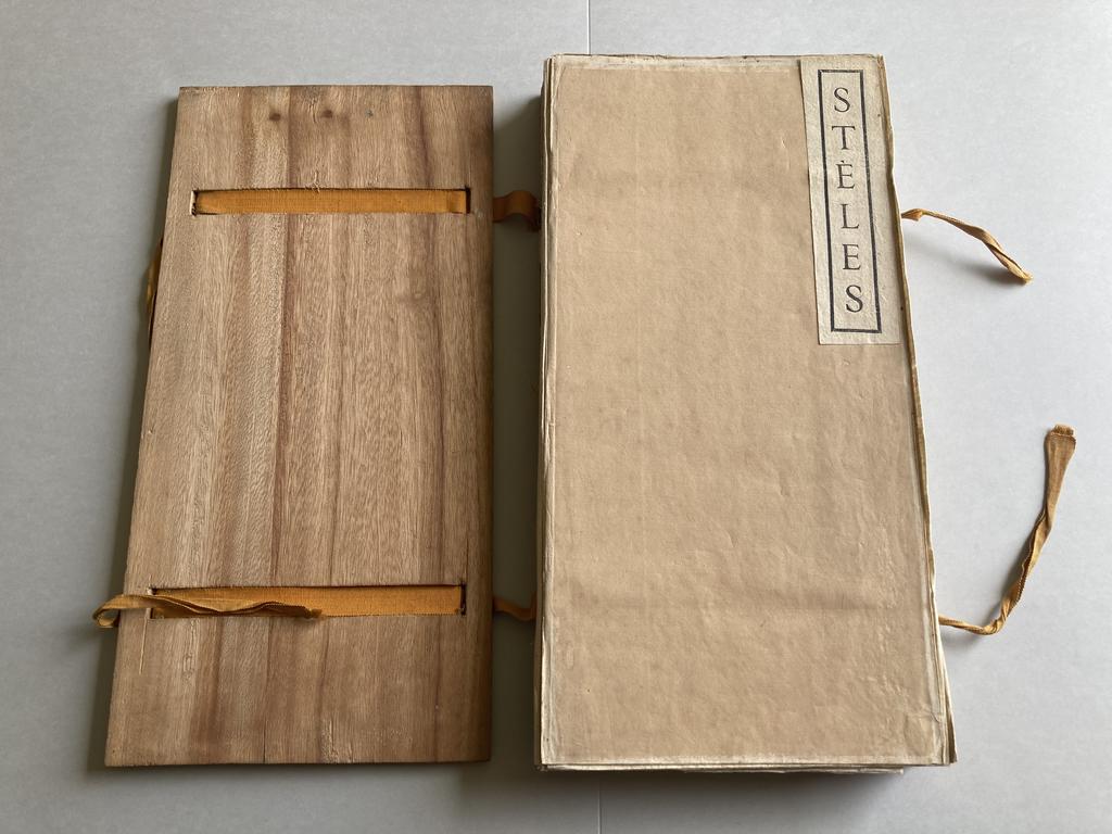Cet exemplaire de Stèles est contenu entre deux plaquettes de bois retenues par deux cordons. Le titre général, celui de chaque partie et celui de chaque poème sont en chinois et en français. Le tirage a été de 640 exemplaires, dont 570 sur vergé feutré, numérotés de 71 à 640 (l’exemplaire conservé à l’Imec est le n° 556).