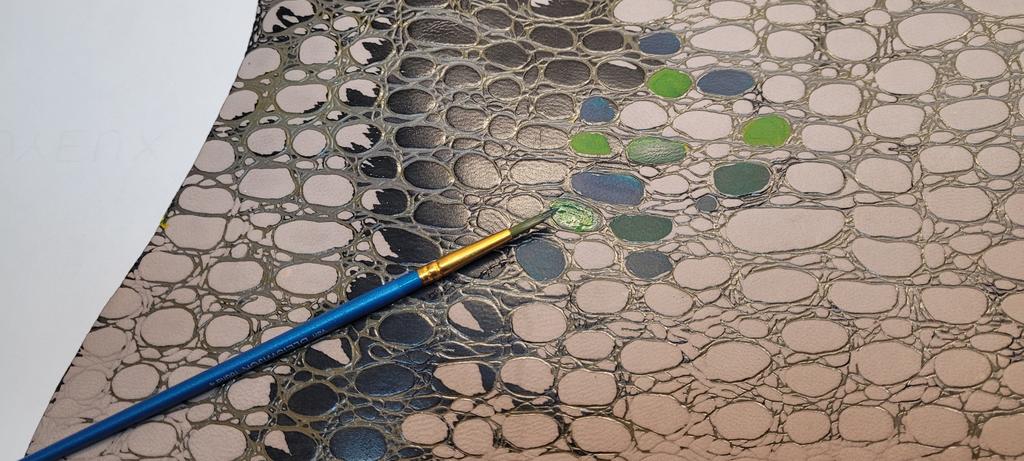 Il faut que la peinture acrylique soit plus épaisse. L’application se fait dans un premier temps au pinceau sur cuir box uniquement ou, dans cet exemple, sur polymère. Couvrir régulièrement la surface, sans attendre qu’elle sèche, avec une spatule ou tout autre objet. Racler cette surface. Vous pouvez ajouter une couleur avant séchage définitif et surexposer les dessins. La base jaune se mélangera à la nouvelle couleur, laissant apparaître d’autres tons. Une fois sèche, la composition est stabilisée et adhère parfaitement au support – qu’il soit en polymère ou cuir –, dans la mesure où c’est du box. Je conseille de faire un essai sur un morceau avant la composition finale.