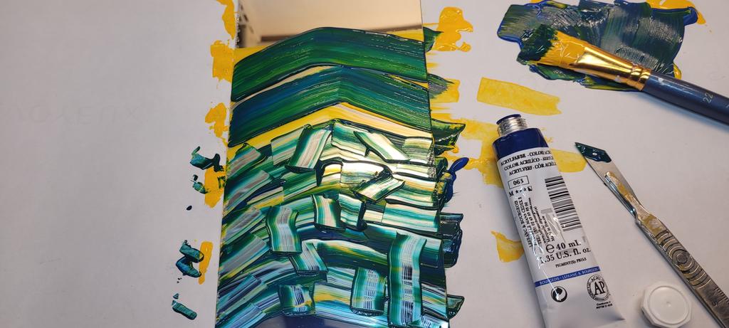 Les différentes couleurs ont été appliquées au pinceau, puis raclées avec une bande en carton. Elles se sont ainsi mélangées, formant un dégradé.