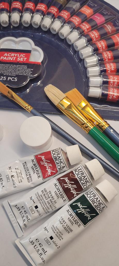 De nombreuses marques vendent de la peinture acrylique, en pot ou en tube, à vous de choisir. Avant de l’utiliser, il faut la diluer en fonction du projet : si vous voulez réaliser des dessins, le mélange doit être assez épais. Il vous faudra aussi des pinceaux, gros, moyens et petits. Et différents gobelets pour les mélanges.