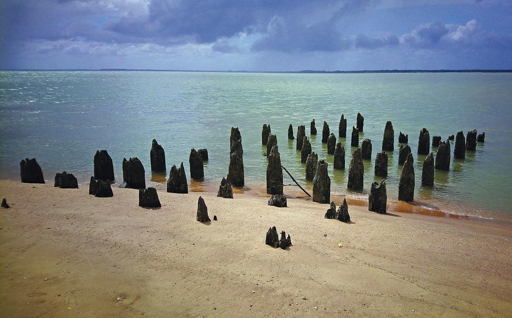 Ponton de la colonie pénitentiaire des Hattes dans l’embouchure du Maroni à Awala-Yalimapo, en Guyane. Ce cliché illustre l’axe 15 : Territoires maritimes, fluviaux et lacustres. © M. Hamblin, ministère de la culture, SA de Guyane, 2019
