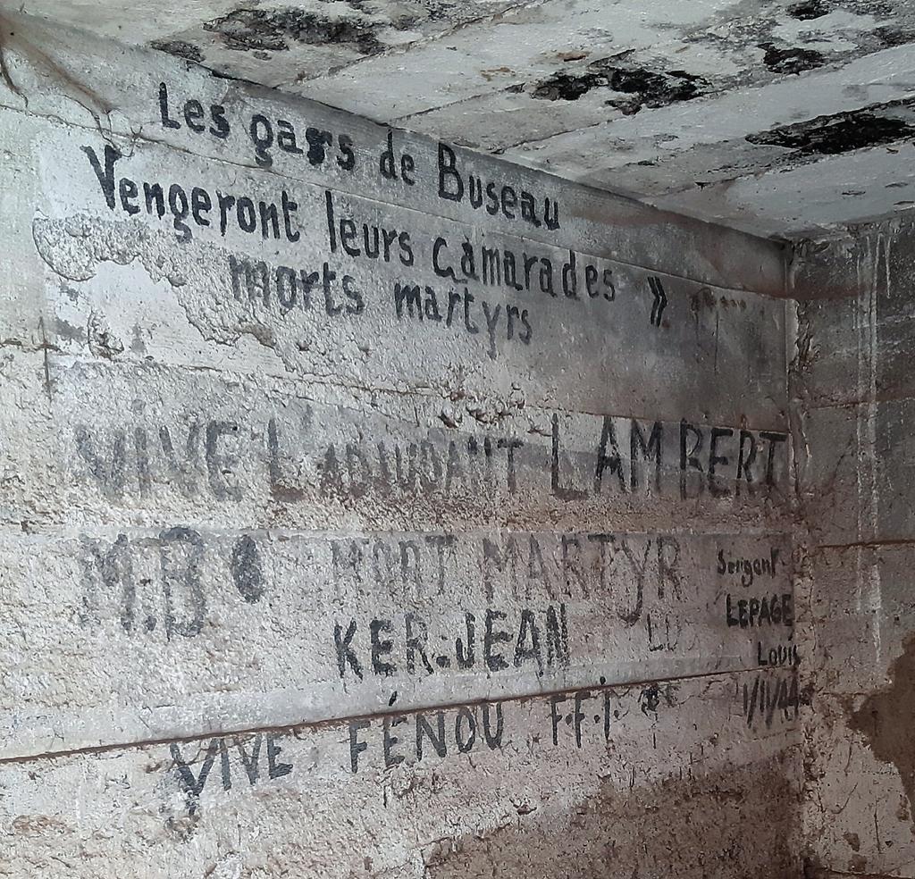 Graffitis tracés par des FFI des maquis de l’arrière-pays malouin sur les murs d’un bunker allemand à la pointe du Grouin, Cancale, Ille-et-Vilaine. Ce cliché illustre l’axe 13 : L’archéologie des conflits. © V. Carpentier