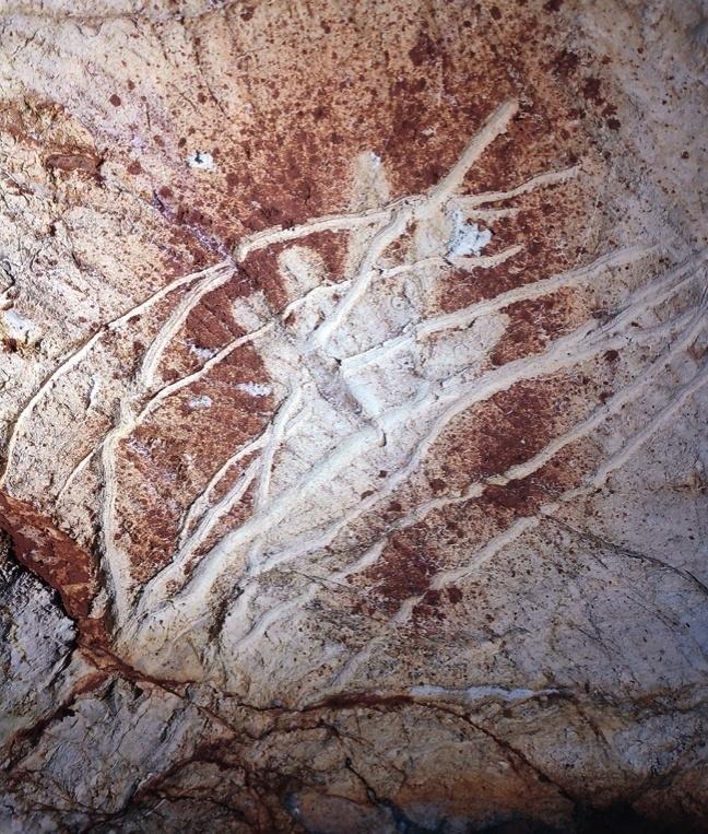 Main négative rouge surchargée de grattages et de tracés digités dans la salle 1 de la grotte Cosquer, Bouches-du-Rhône, 2022. Ce cliché illustre l’axe 3 : Les expressions graphiques pariétales en contexte. Photo Cyril Montoya. © Centre national de Préhistoire, ministère de la Culture