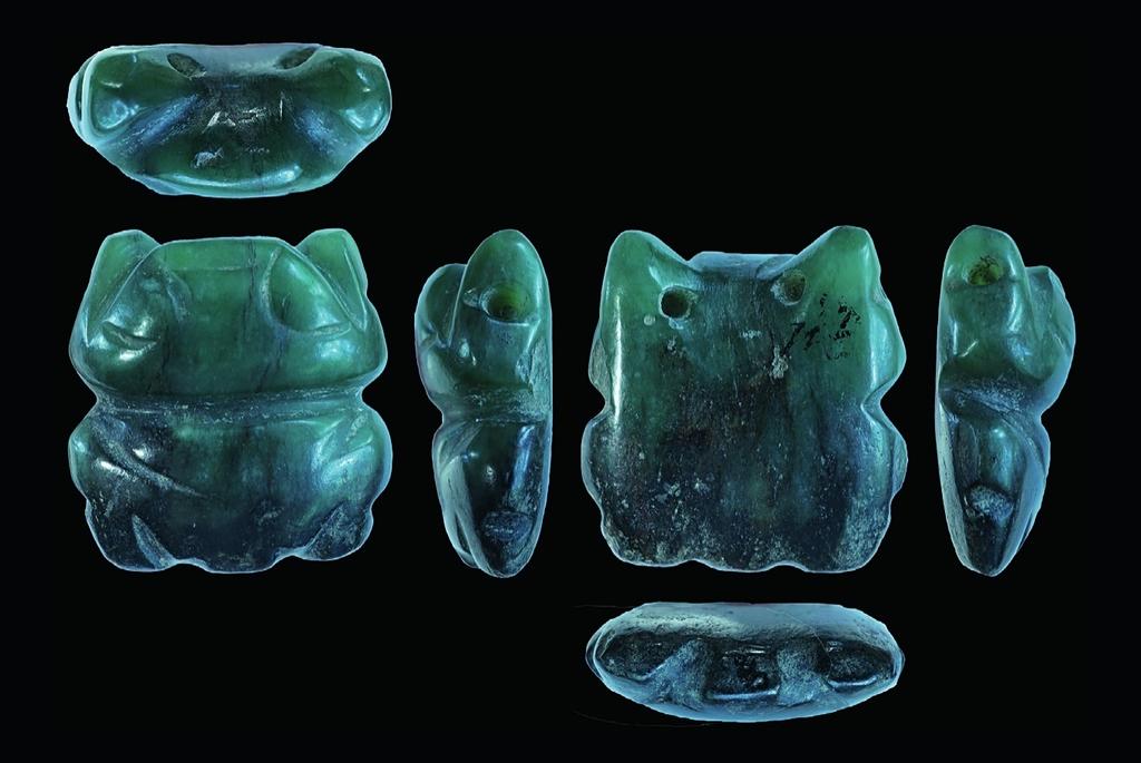 Pendentif zoomorphe en néphrite du Céramique ancien, provenant du site de Vivé, en Martinique. Ce cliché illustre l’axe 11 : Les archéologies des sociétés amérindiennes et inuits. © A. Queffelec