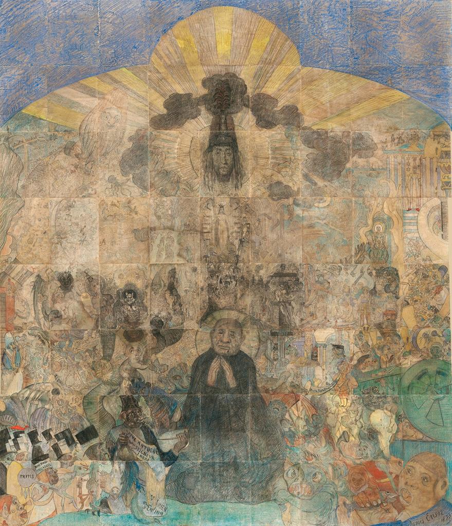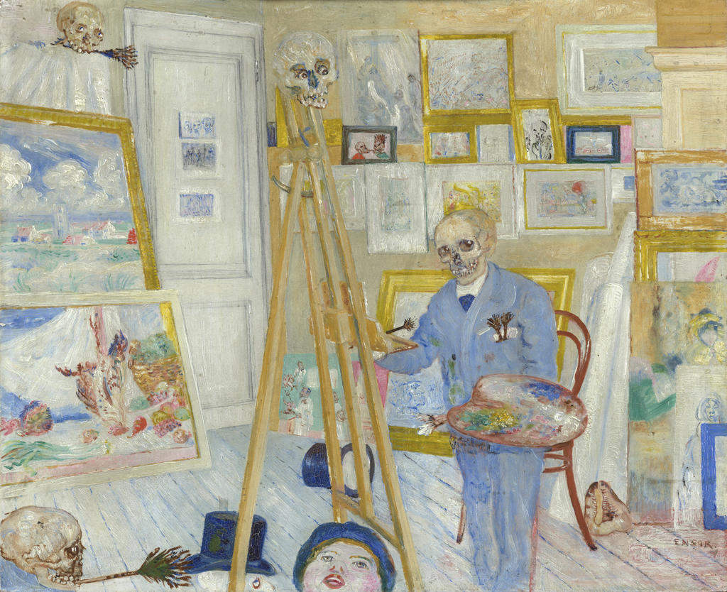 Parmi les chefs-d’œuvre d’Ensor ici réunis figure, bien sûr, un florilège de toiles appartenant aux collections du KMSKA. Citons la Grande vue des toits d’Ostende (1884), Adam et Ève chassés du paradis (1887), L’Intrigue (1890), Le Squelette peintre (1896)… Mais le musée a également bénéficié de nombreux prêts insignes. Une salle est, par exemple, organisée autour de la monumentale Tentation de saint Antoine de 1887, œuvre graphique résultant du collage de 51 feuilles de papier, acquise en 2006 par l’Art Institute de Chicago et récemment restaurée. Plusieurs œuvres de maturité mettant en scène des masques et des squelettes ont également traversé l’Atlantique pour l’occasion ; c’est le cas des Masques raillant la Mort (1888, MoMA, New York), des grotesques Squelettes voulant se réchauffer (1889, Kimbell Art Museum, Fort Worth) ou encore des intrigants Squelettes à l’atelier (1900, National Gallery of Canada, Ottawa).