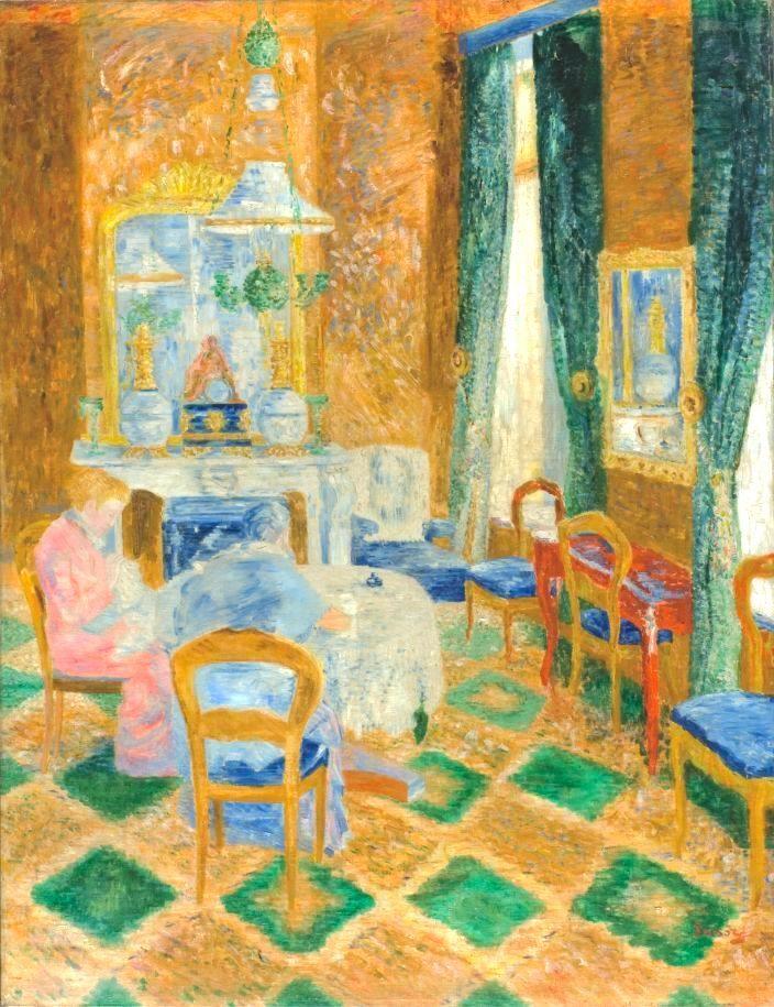 Tout au long de sa carrière, Ensor a inlassablement innové, détourné les codes, enfreint les règles pour en imposer de nouvelles. Il ne fait pourtant jamais table rase du passé et revient régulièrement explorer ses sujets de prédilection. Vers 1910, il se lance même dans une étonnante série de reprises d’œuvres des années 1880, qui traduisent bien la tension toujours sous-jacente entre continuité et rupture. Peint alors qu’Ensor n’a que 21 ans, Le Salon bourgeois du KMSKA est ici confronté à la version réalisée 30 ans plus tard. La composition initiale représentant deux femmes installées dans un élégant salon bourgeois est fidèlement reproduite, mais le style se révèle radicalement différent : la touche est plus enlevée et fragmentée, tandis que les teintes sombres laissent place à une palette bariolée.