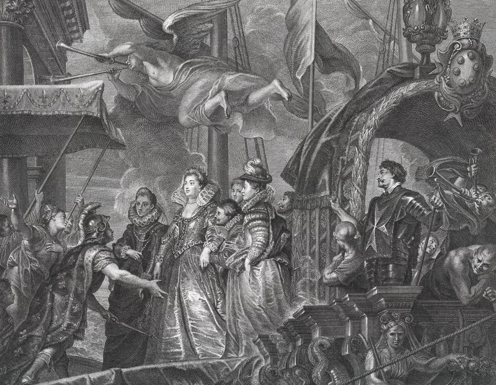 Gaspard Duchange, d’après Pierre Paul Rubens (via un dessin de Jean-Baptiste Nattier), Débarquement de la reine à Marseille, le 3 novembre 1600, 1710. Détail. Eau-forte et burin, 50,7 x 35,4 cm. Genève, musée d’Art et d’Histoire. Photo MAH, cabinet d’arts graphiques, Genève