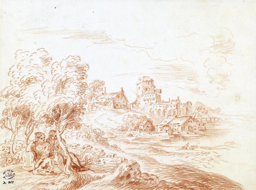Antoine Watteau, Paysage avec musiciens assis sous des arbres, avant 1721. Sanguine sur papier, 19,2 x 25,8 cm. Besançon, musée des Beaux-Arts et d’Archéologie © Besançon, musée des Beaux Arts et d’Archéologie – P. Guenat