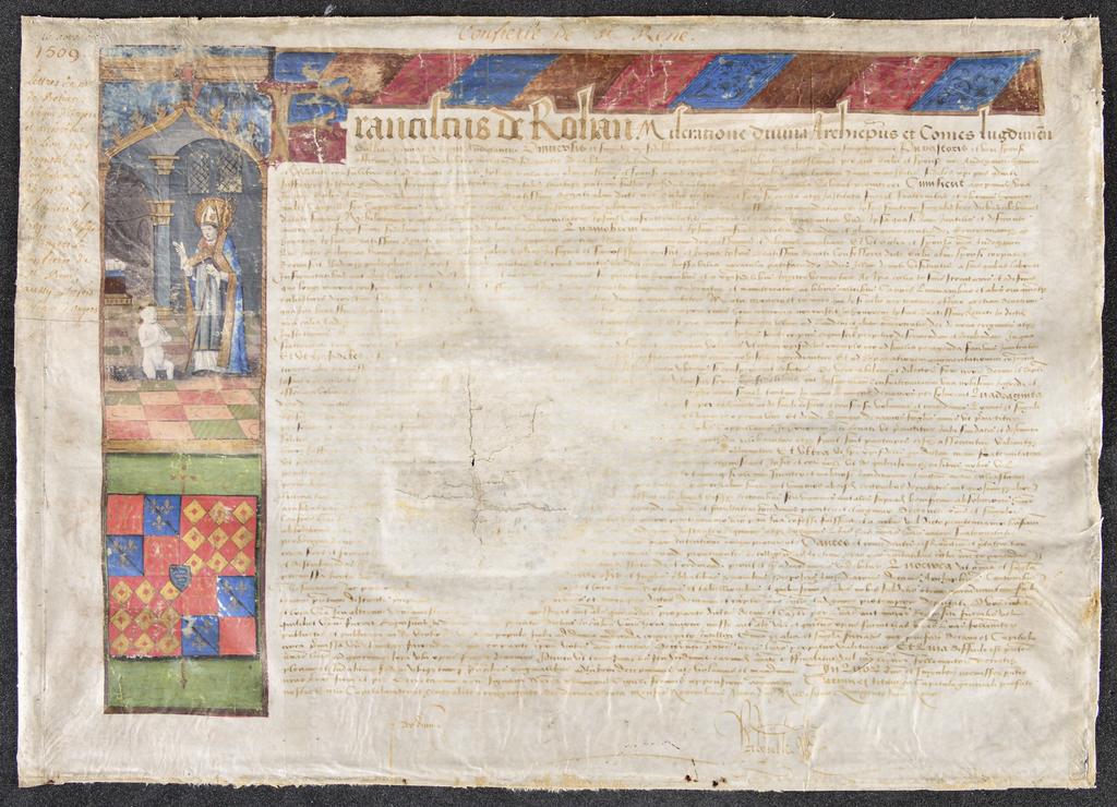 François de Rohan (1479-1536), lettre de refondation et d’indulgences de la confrérie Saint-René de la cathédrale d’Angers, 1509. Parchemin. Photo service de presse © Musées d’Angers, D. Riou