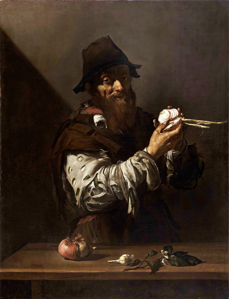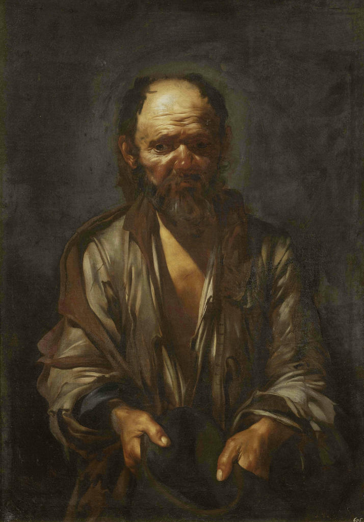 Ribera à Rome reprend l’un des fondements de la leçon du Caravage : l’usage du modèle vivant. Mais si le maître lombard travestissait ses jeunes éphèbes sous l’apparat d’un Bacchus ou d’un ange, Ribera représente ses modèles tirés de la rue dans leur absolu dénuement. C’est là une révolution. Il fait l’honneur d’un portrait à taille réelle à un simple mendiant et jamais auparavant on n’avait porté une telle attention sincère à une figure du peuple. Avec son regard direct, ses mains rougeaudes qui nous tendent un béret pour demander l’aumône, ce marginal en haillons saisit profondément par la vérité de son dépouillement.