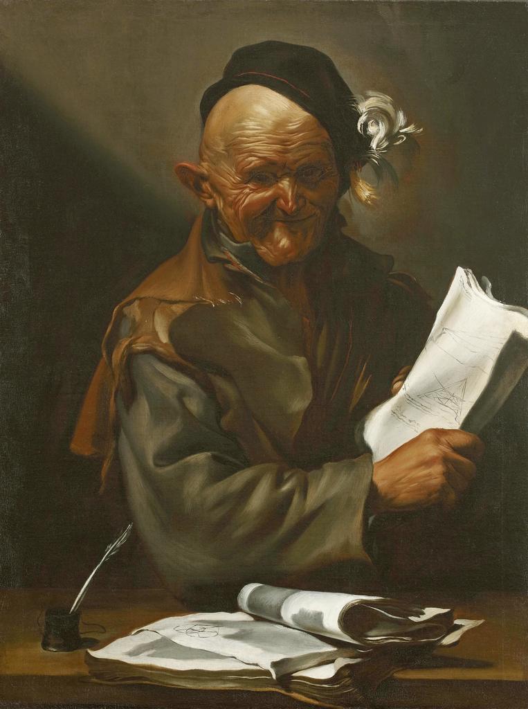 À Naples, c’est au duc d’Alcalá que l’on doit la commande d’une typologie nouvelle de philosophes-mendiants dont Ribera est le génial inventeur. Les plus grands penseurs sont représentés en indigents, surgissant puissamment d’un fond sombre, provocants et superbes. Ils sont l’occasion d’une extraordinaire exploration des expressions humaines. Ses figures, entre le noble et le prosaïque, où l’artiste s’est davantage concentré sur la vérité psychologique que sur l’identification précise des personnages, sont marquées par une certaine dérision revendiquée et la proclamation d’une dignité de la pauvreté. Ses sujets sont chargés d’intériorité et de concentration, ils captivent par leur présence silencieuse. S’ils s’interrogent sur des sujets existentiels, ils « nous » interrogent en retour.