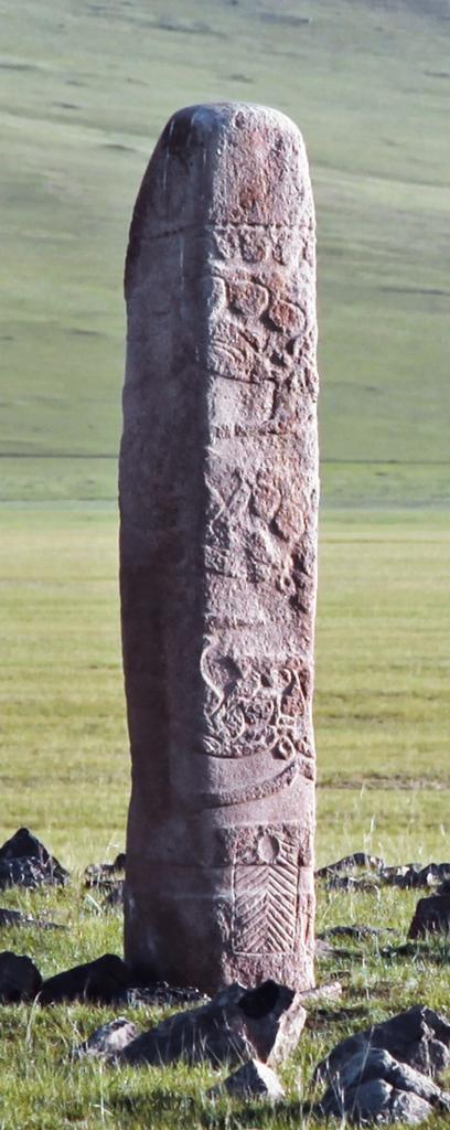 Cette stèle, qui a été étudiée de près, se compose de registres superposés, figurant, de bas en haut, le monde souterrain, le monde terrestre, le monde intermédiaire, la course du soleil puis le soleil à son zénith. Au sommet du monolithe, deux cercles de tailles différentes sont gravés l’un à côté de l’autre : le plus grand semble représenter le soleil et le plus petit est interprété comme la lune. Dans le registre terrestre on identifie des arcs, carquois, boucliers, ceintures, poignards, haches et chevaux ; celui intermédiaire est uniquement fréquenté par des cerfs.