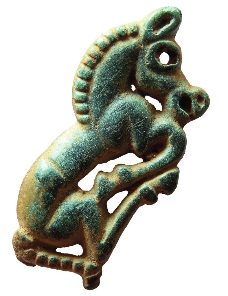 Cette plaque représente un cheval, les pattes repliées sous le corps, en pleine course. Des stries parallèles très marquées matérialisent les poils de la crinière et de la queue. Le cheval est le seul animal domestique représenté dans l’art des steppes. Le motif du cheval dit « au galop volant » est un motif iconographique récurrent dans l’art des steppes, de la Mongolie aux rives de la mer Noire. Cet objet a probablement été réalisé selon la technique de la fonte à la cire perdue pour être cousu sur des vêtements.