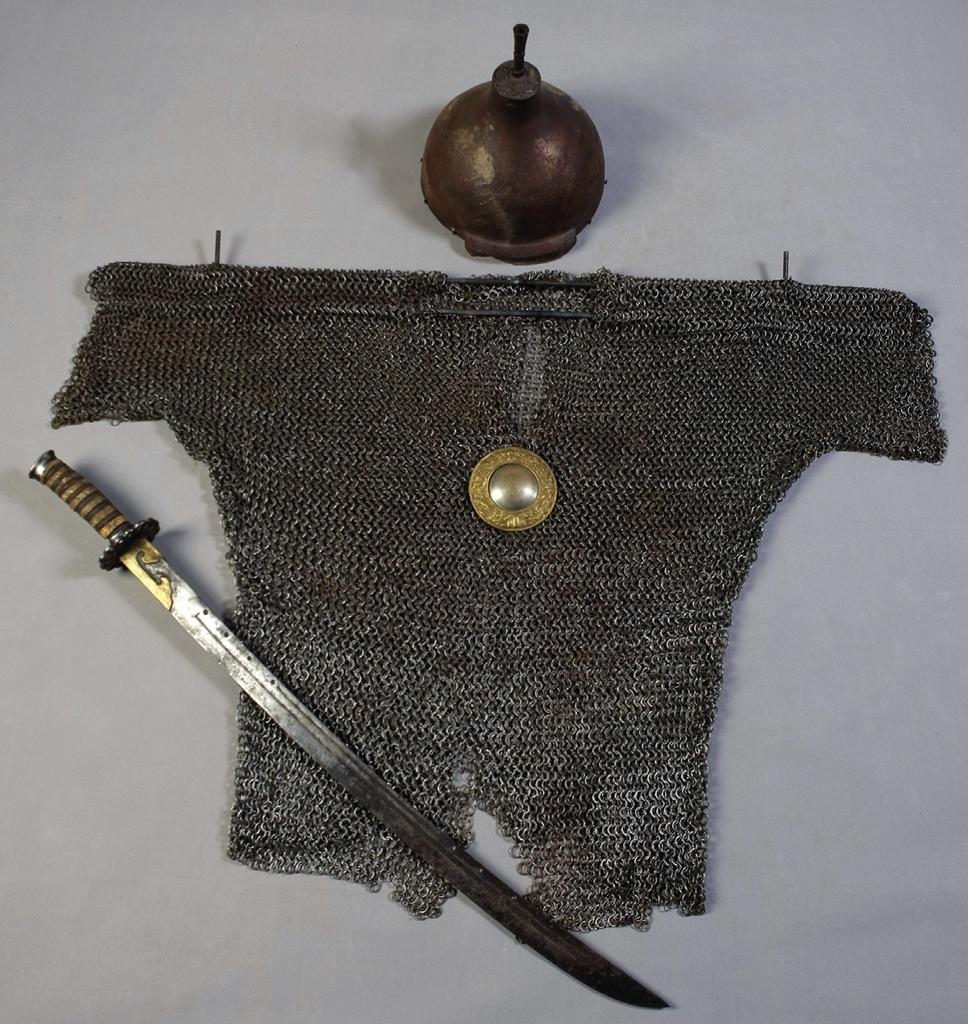 Cotte de mailles avec petite plaque miroir et sabre. Fer, cuivre, 1368-1634. Mongolie, Collection Erdenechuluun Purevjav & Nemekhbayar Nadpurev. © Mongolie, collection Erdenechuluun Purevjav & Nemekhbayar Nadpurev