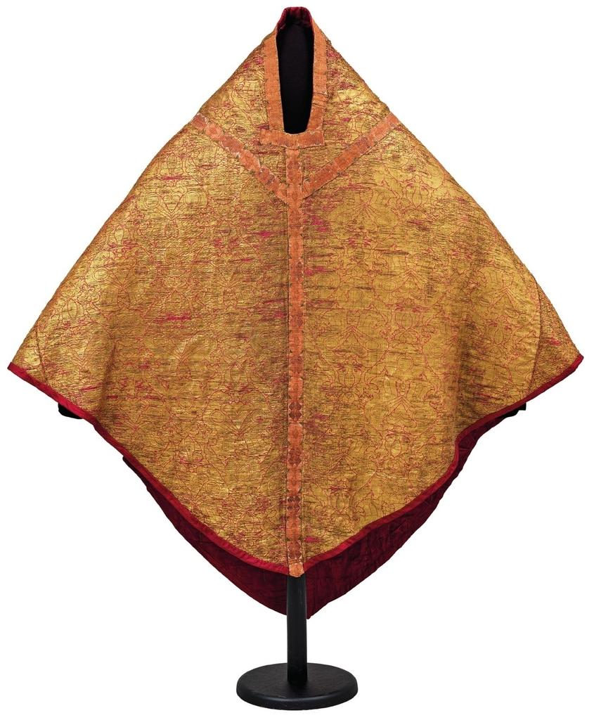 Chasuble dite de sainte Aldegonde. XIIIe siècle. Tissu de soie et fils d’or, cuir doré. Objet classé au titre des Monuments historiques. Maubeuge, trésor de l’église Saint-Pierre-et-Saint-Paul. © RMN – Grand Palais – René-Gabriel Ojeda – Mathieu Rabeau / SP
