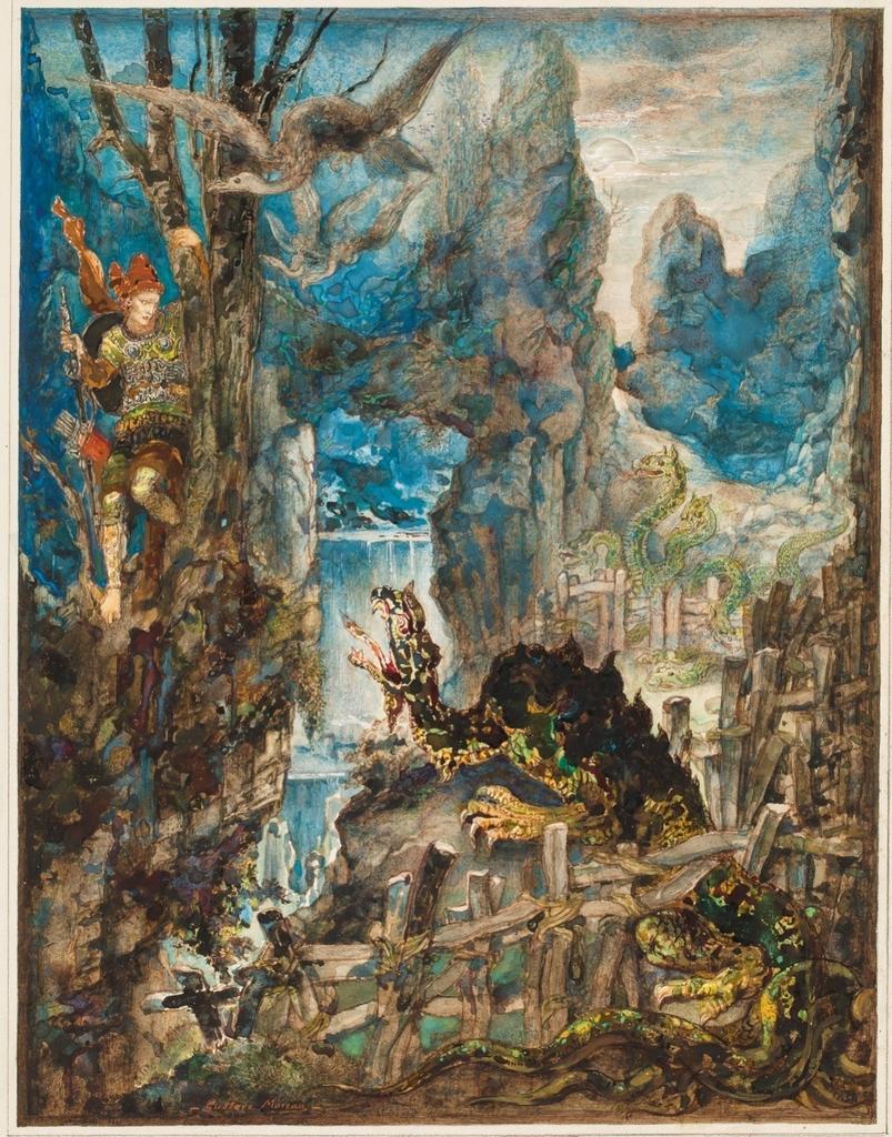 Ici apparaît un animal, motif jusqu’alors exceptionnel dans sa peinture. Conscient de sa méconnaissance de l’anatomie animale, Moreau va tout faire pour pallier cette lacune ; ainsi, il se rend plusieurs semaines durant au Jardin des Plantes pour croquer les attitudes de ses futurs héros en se postant devant la cage du lion Brutus, l’enclos de l’éléphant Bangkok ou les volières des vautours – dont il ne nous a pas laissé les noms. Pour des animaux plus sociables et moins encombrants, il a recours à son commanditaire. Celui-ci s’adresse à un marchand d’animaux et empailleur et fait livrer à plusieurs reprises des animaux vivants à l’atelier du peintre, ce qui nous vaut cette correspondance étonnante, datable de la fin de l’année 1883 ou du début de la suivante : « Je sors de chez l’Empailleur, vrai marchand de loups ; il m’a promis que vous recevriez tous ces animaux demain matin. Ils seront vos hôtes (les heureux) pour huit jours à renouveler pour huit autres jours si cela vous est nécessaire. Quant aux grenouilles, je ne pourrai les avoir que Lundi ou Mardi – elles vivront pendant huit à dix jours, ce ne sera qu’une lente agonie, le marchand prétendant qu’il leur faut des mouches ou des vers. Cependant si pour le succès de l’aquarelle cinq ou six jours étaient suffisants (voyez à côté de la philanthropie, l’intérêt), vous pourriez les abandonner dans votre joli petit jardin – elles seraient alors soumises simplement aux lois immuables qui régissent les êtres animés. » Toutes ces références ne doivent pas faire oublier la capacité d’invention de Moreau, qui a su pousser sa réflexion bien au-delà des modèles dans une œuvre telle que Le Dragon à plusieurs têtes…, menant sa création aux limites de l’abstraction.