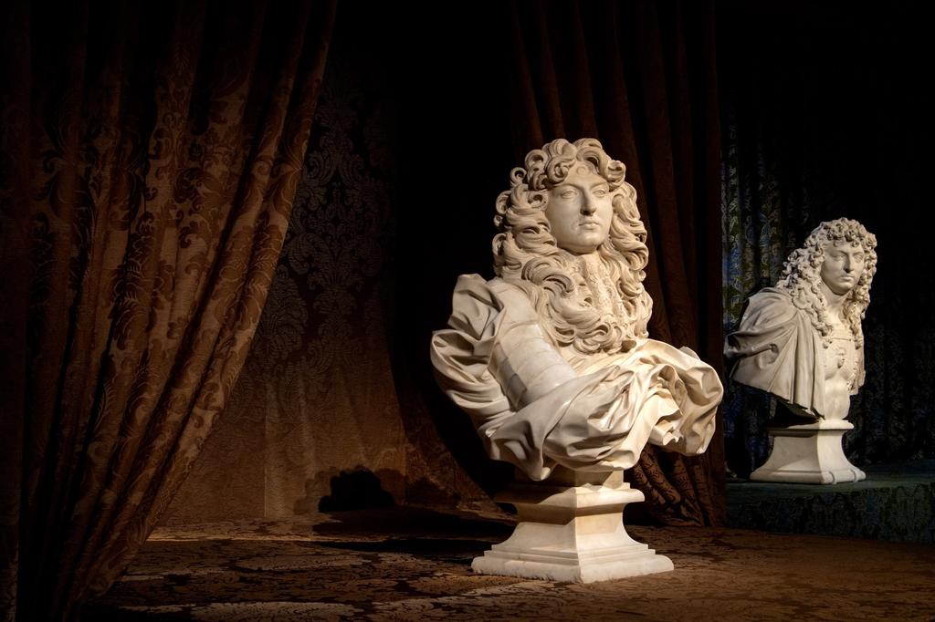 Vue de l'exposition. Bustes de Louis XIV par Bernin et Jean-Jacques Clérion. Photo service de presse. © château de Versailles, T. Garnier