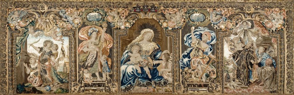 La riche iconographie de l’antependium est inspirée par les œuvres des plus grands maîtres. En son centre est représentée une Vierge à l’Enfant, selon une composition qui emprunte à la fois à la Sainte Famille au lys de Jacques Stella (1596-1657), reproduite en gravure par François de Poilly l’Ancien, et à une estampe de Gilles Rousselet (1610-1686) traduisant un tableau de l’Albane. Elle est entourée des deux saints patrons de l’ordre des Ursulines : sainte Ursule d’après Romanelli, et saint Augustin, d’après le tableau d’autel peint par Antoon van Dyck (1599-1641) pour l’église Saint-Augustin à Anvers. Cette dernière composition a toutefois été adaptée par les brodeuses qui se sont également inspirées de l’estampe La Sainte Trinité à l’Enfant Jésus emmailloté gravée par François de Poilly l’Ancien à partir d’un tableau de Pierre Mignard (1612-1695). L’étude de cette iconographie complexe, associant des modèles aussi variés, a fait resurgir des figures oubliées d’artistes parmi les Ursulines, comme Madeleine Varin (sœur Sainte-Madeleine), fille de Quentin Varin (vers 1575-1626), qui passait pour « fort sçavante & experimentée en la peinture & en la broderie ».