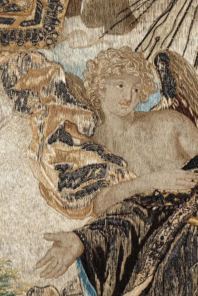 Ursulines d’Amiens, Antependium, L’Extase de saint Augustin (détail), vers 1660. Broderie de fils de laine, fils de soie, fils métalliques, perles, pierres fines, verroterie, 95 x 293 cm. Amiens, musée de Picardie. Photo service de presse. © Musée de Picardie / Irwin Leullier
