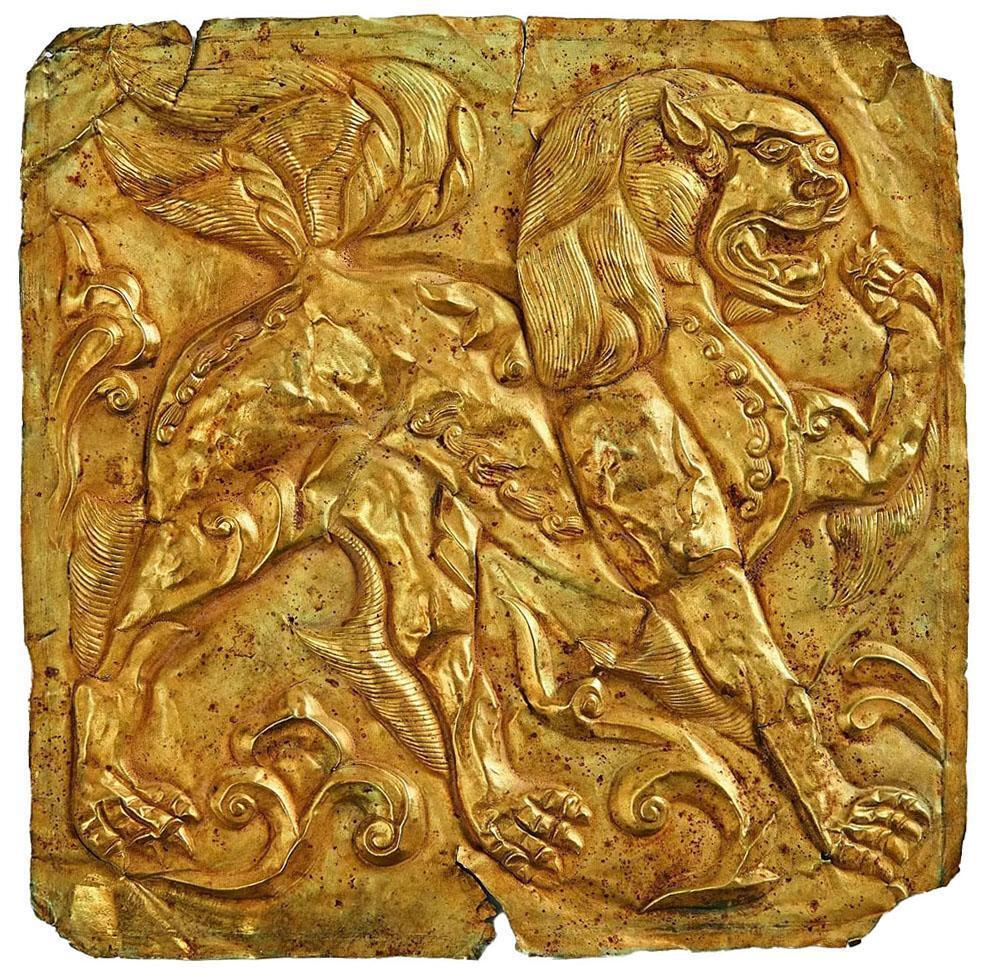 Plaque d’ornement à motif de lion, époque Tang, période Tubo (VIIe-IXe siècle). Argent doré. Xining, musée de la culture médicinale tibétaine du Qinghai. Photo service de presse. © Musée de la culture médicinale tibétaine du Qinghai