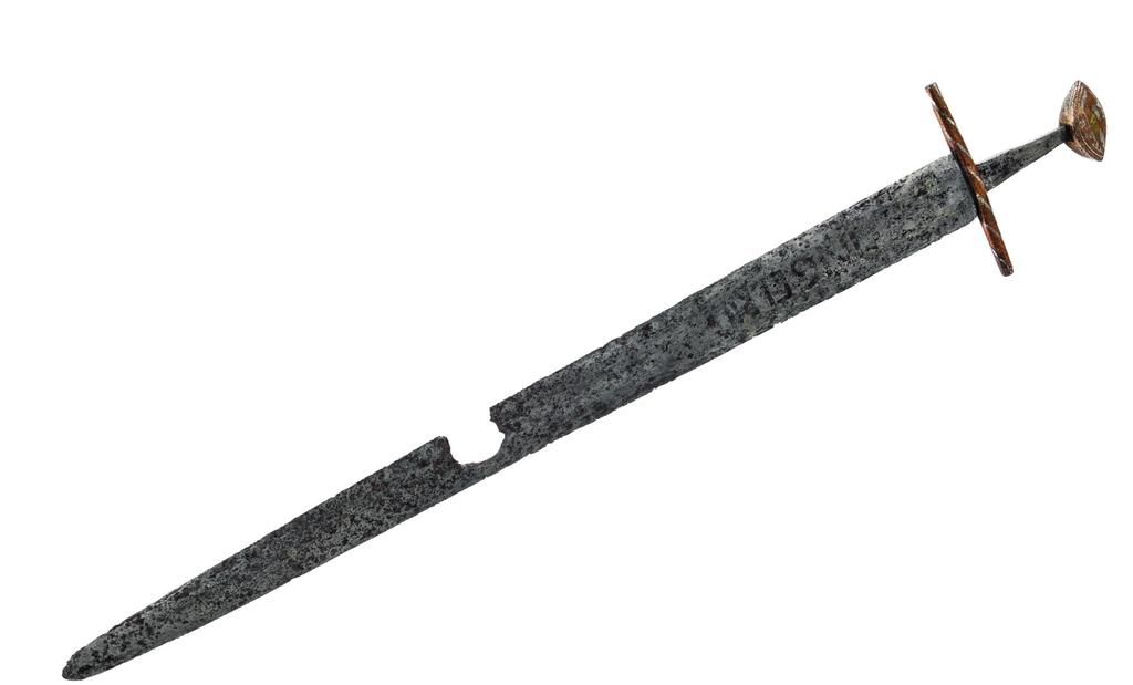 Épée marquée « Ingelrii », Europe de l’Ouest, Xe -XIe siècles. Alliage cuivreux et ferreux, 90 x 16,8 cm. Le Mans, musée Jean-Claude-Boulard – Carré Plantagenêt. © Musées du Mans